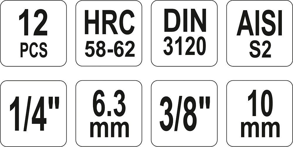 Délky bitů 37 a 48 mm, určené pro 1/4" a 3/8" ráčny. V sadě je kovový držák bitů a samotné bity T8-T55. Splňuje normu DIN 3120 pro vysoce-zatěžovatelné nástavce.