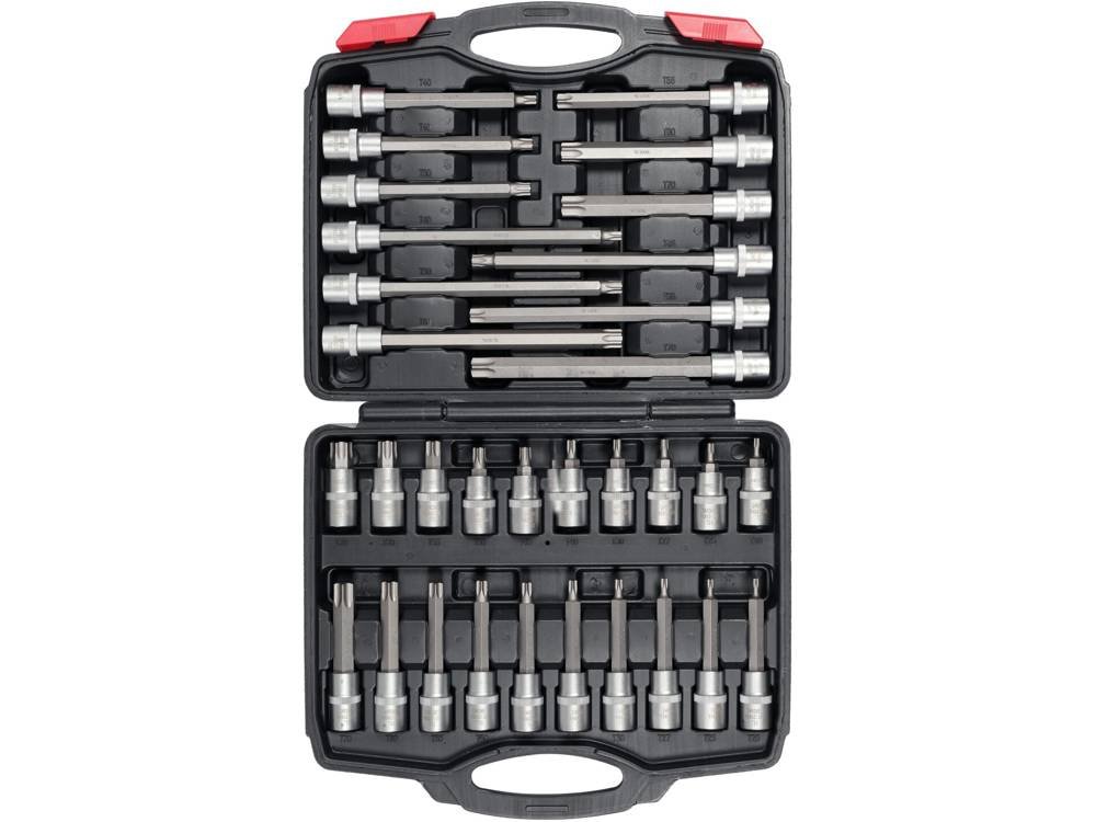 Sada kvalitních zástrčných prodloužených klíčů torx s bitem pevně spojeným s hlavicemi se čtyřhranem 1/4" a 1/2".• Nástrčné hlavice torx sada 18 kusů T10-T60 Yato• Hlavice torx 1/4" ...