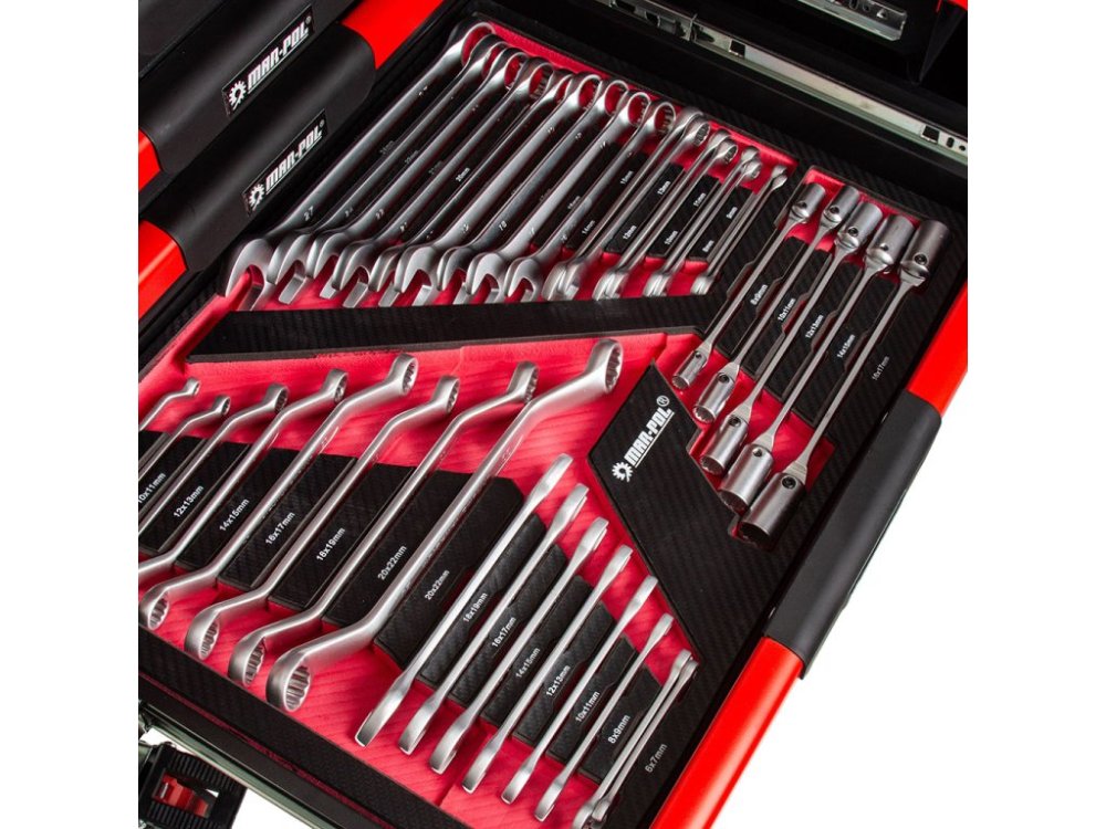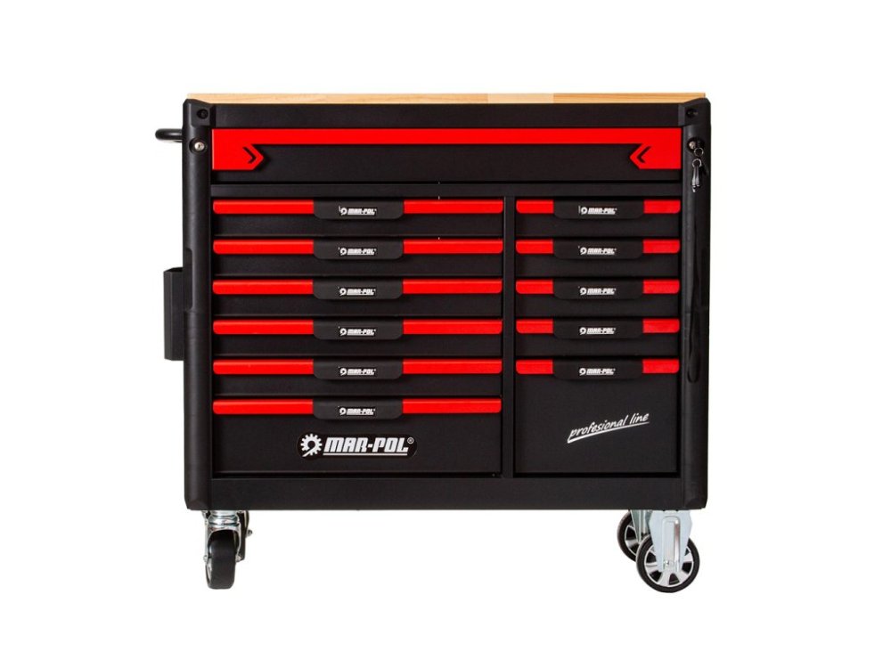 Dílenský vozík, 12 zásuvek, dřevěná deska, sada nářadí 293 ks - MAR-POL