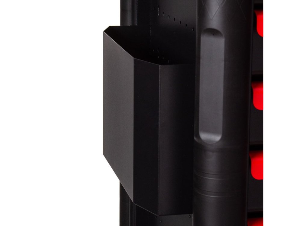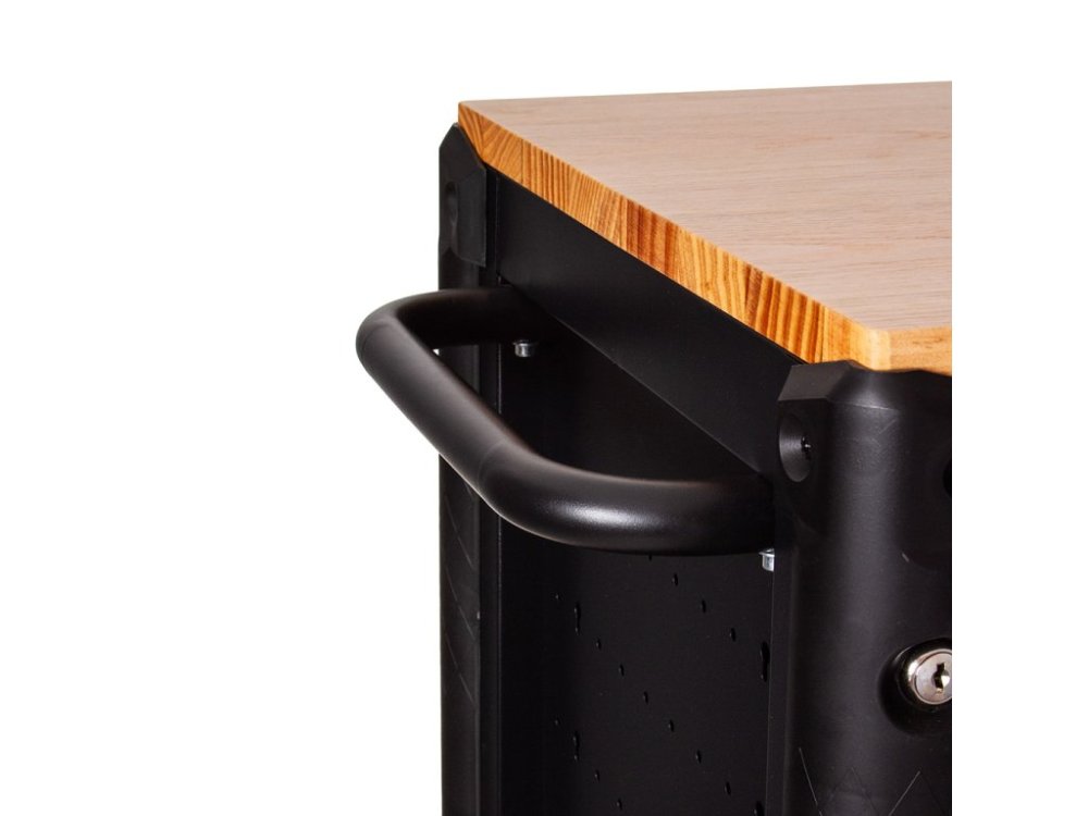 Vrchní deska z tvrdého lakovaného dřeva poskytuje odolný, rovný pracovní povrch, ideální pro montáže, skládání či drobné opravy. Univerzálně perforované boční stěny umožňují snadné připevnění držáků na nářadí, háčků, držáků na spreje nebo ručníky. Prázdná zásuvka a dvoupatrový uzamykatelný úložný prostor jsou připraveny na další rozšíření.