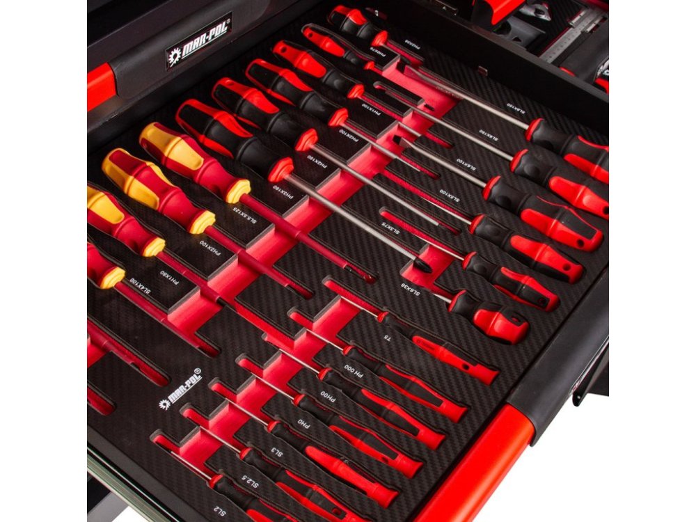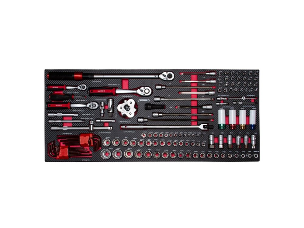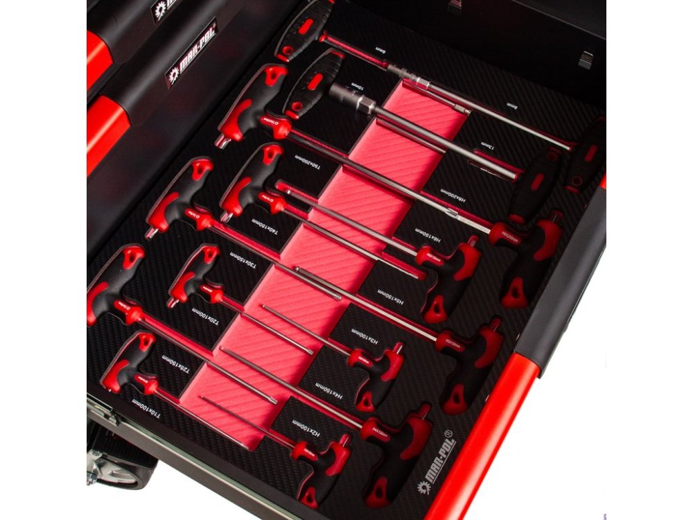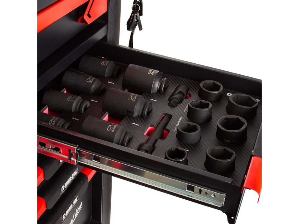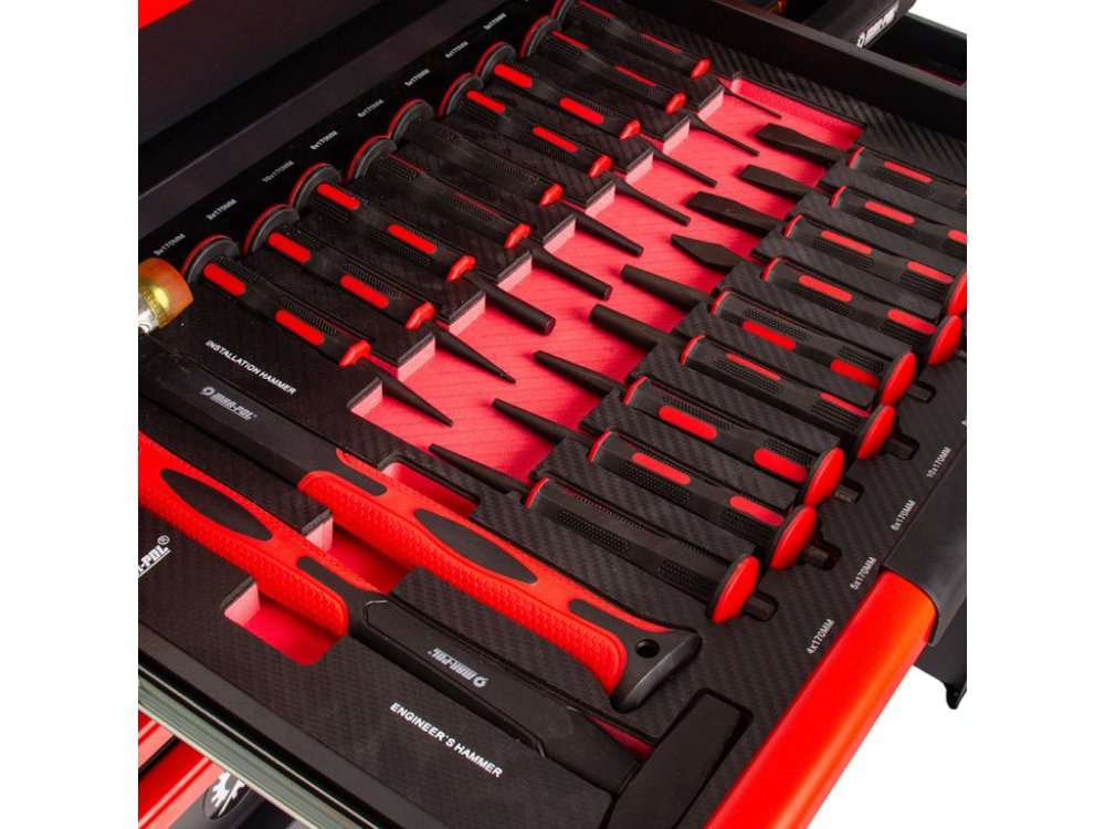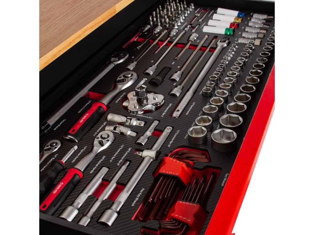 Nářadí je uloženo ve vložkách z materiálu typu EVA, které tvoří součást šesti zásuvek. Tyto vložky poskytují výjimečnou odolnost proti nečistotám, vodě a oleji. Rovněž usnadňují organizaci a zajišťují, že každé nářadí má své pevné místo.