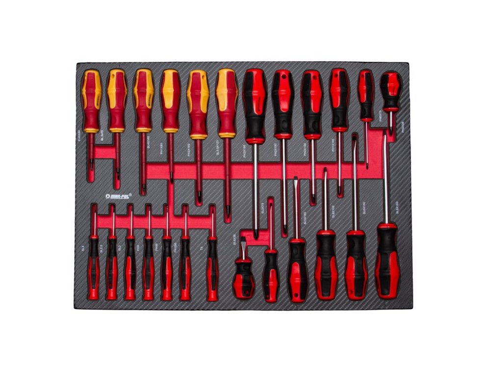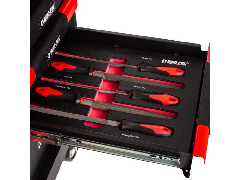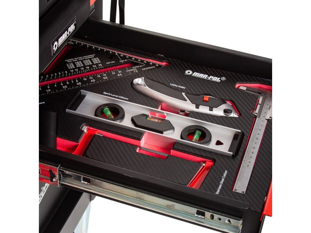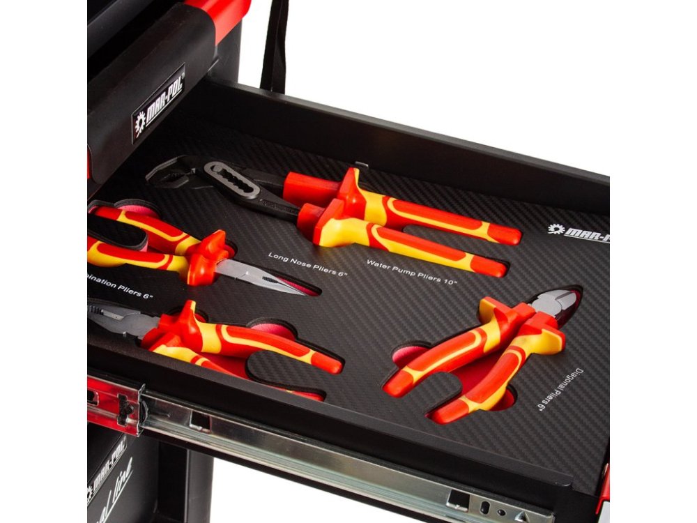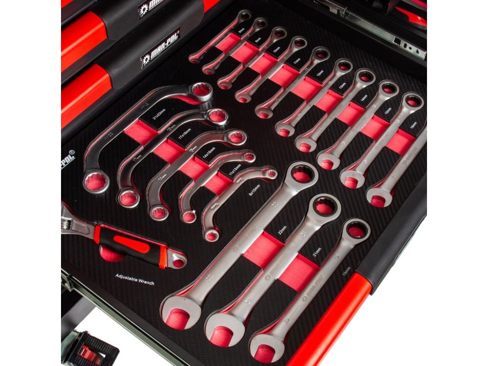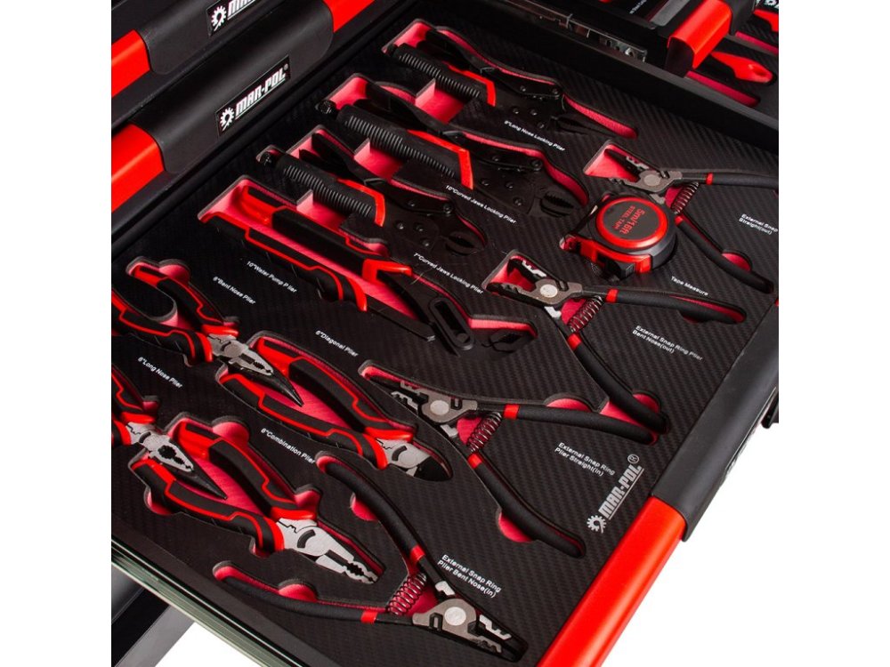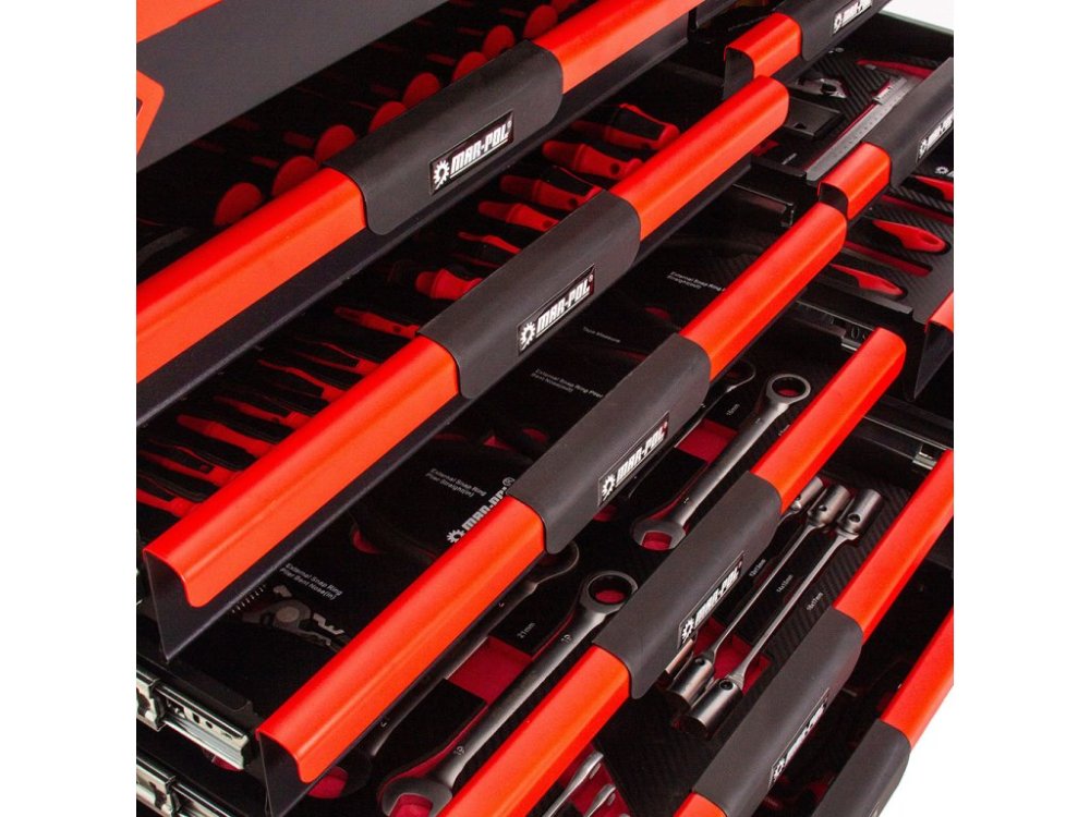 Nářadí je uloženo ve vložkách z materiálu typu EVA, které tvoří součást šesti zásuvek. Tyto vložky poskytují výjimečnou odolnost proti nečistotám, vodě a oleji. Rovněž usnadňují organizaci a zajišťují, že každé nářadí má své pevné místo.