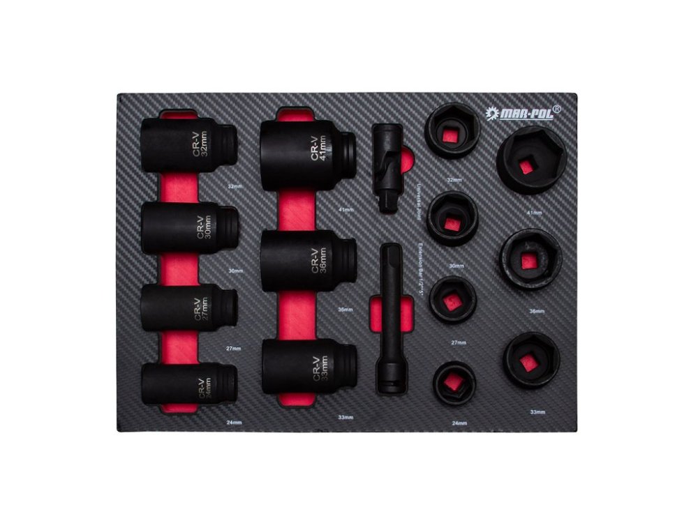 - 19 ks - šestihranná nástrčná hlavice 1/2": 8 / 9 / 10 / 11 / 12 / 13 / 14/ 15 / 16 / 17 / 18 / 19 / 20 / 21 / 22 / 24 / 27 / 30 / 32 mm