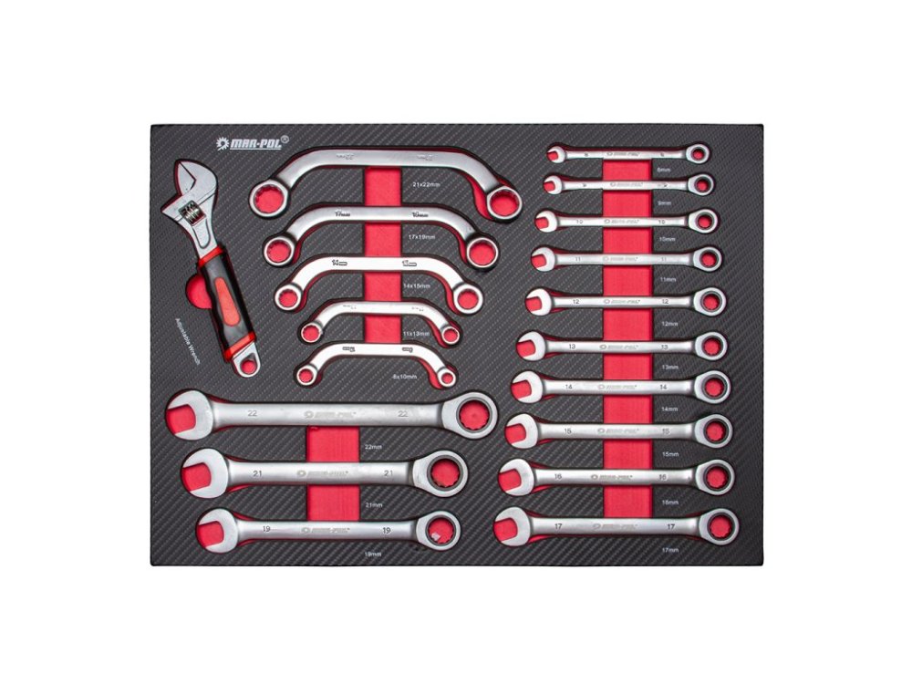 - 8 ks - oboustranný plochý klíč: 6x7, 8x9, 10x11, 12x13, 14x15, 16x17, 18x19, 20x22 mm