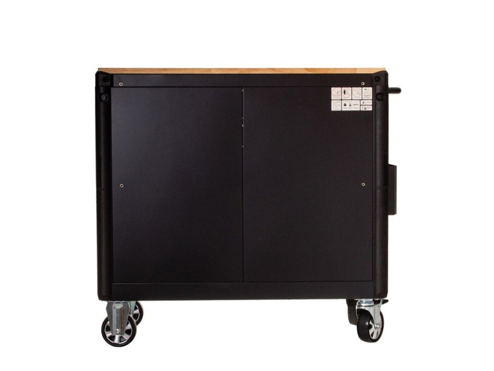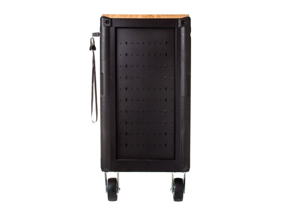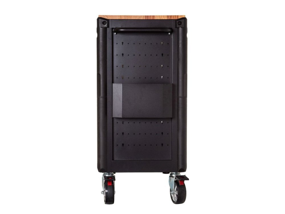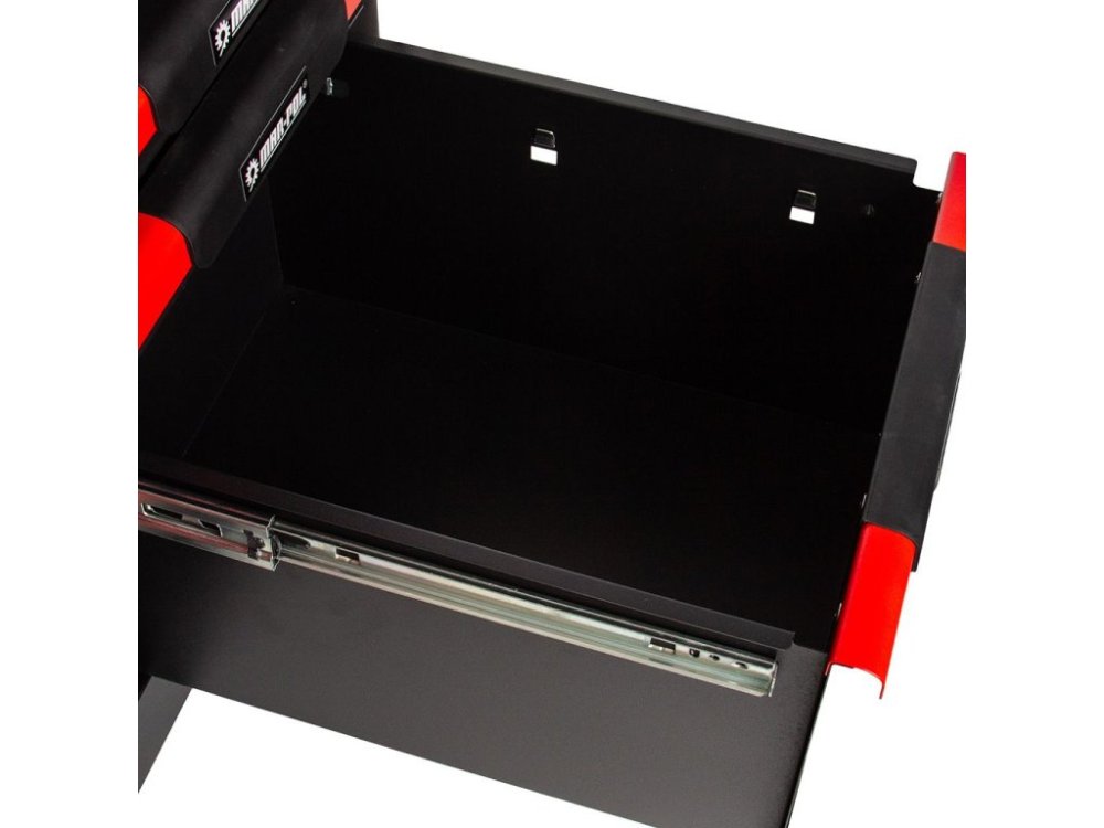 Dílenský vozík obsahuje dvanáct prostorných zásuvek s plně výsuvným mechanismem na kuličkových ložiskách, které se snadno vysouvají a zajišťují plynulý pohyb. Horní lakovaná dřevěná deska poskytuje kvalitní pracovní plochu pro montážní a servisní práce.