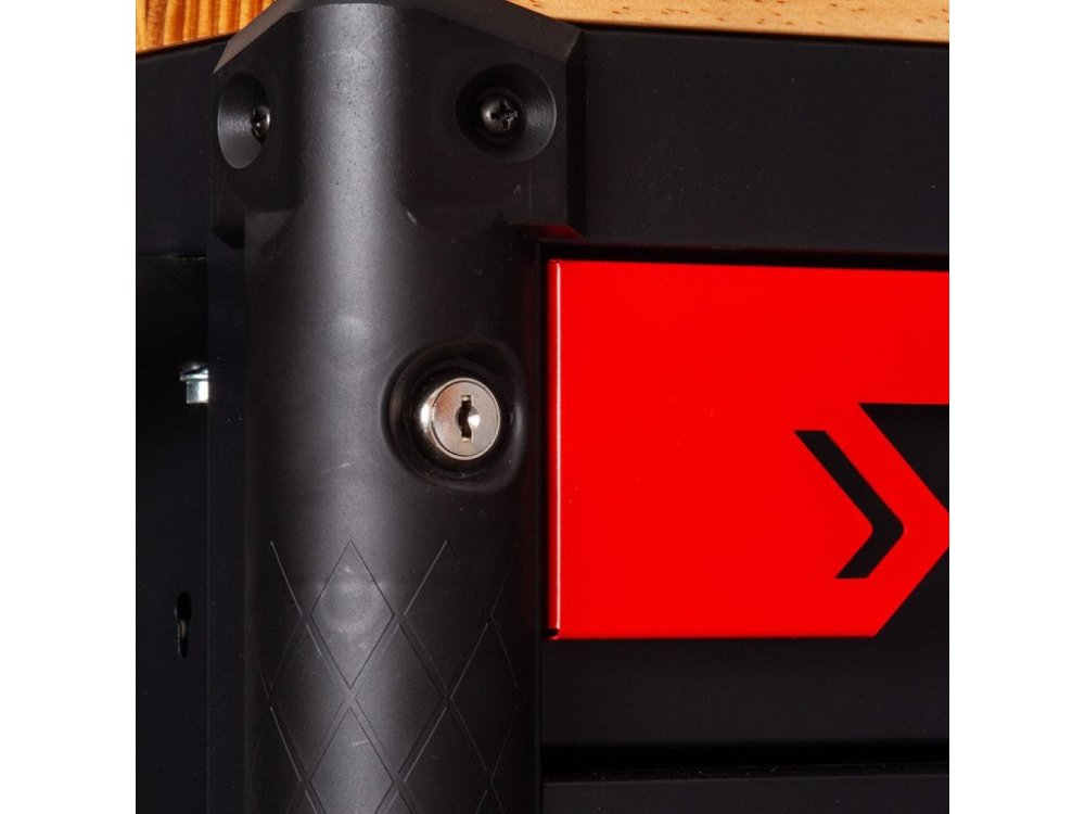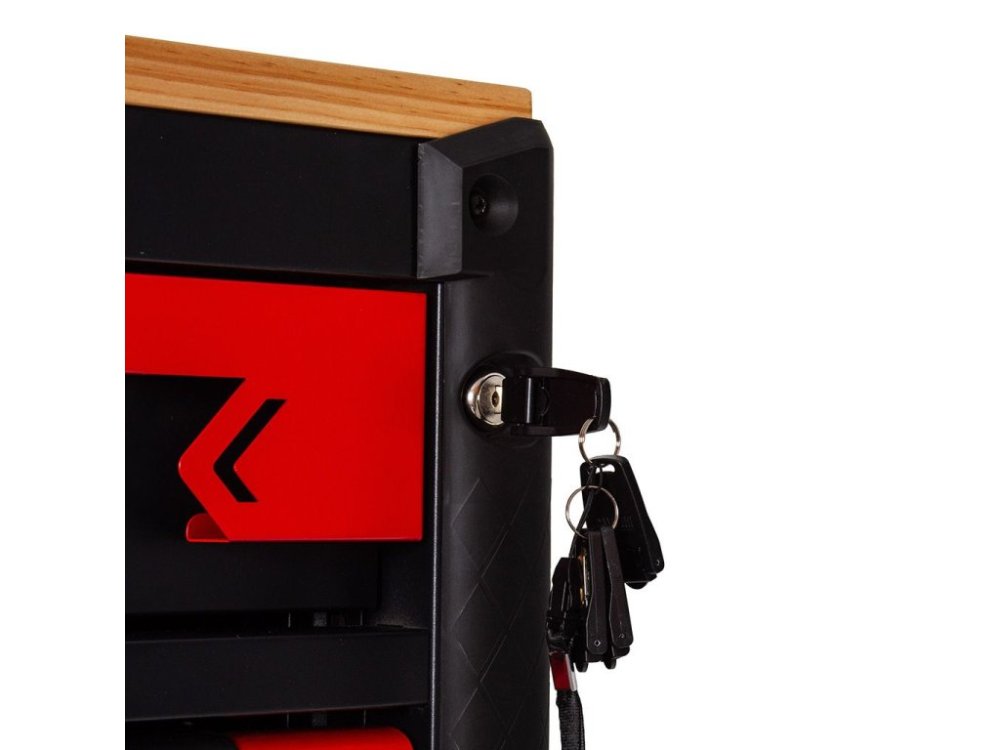 Vozík pomáhá udržovat pořádek na pracovišti a chrání nářadí před neoprávněným přístupem díky centrálnímu zámku na klíč. Všechny zásuvky jsou zajištěny zámkem se dvěma klíči v balení. Rohové nárazníky navíc chrání před náhodným poškozením.