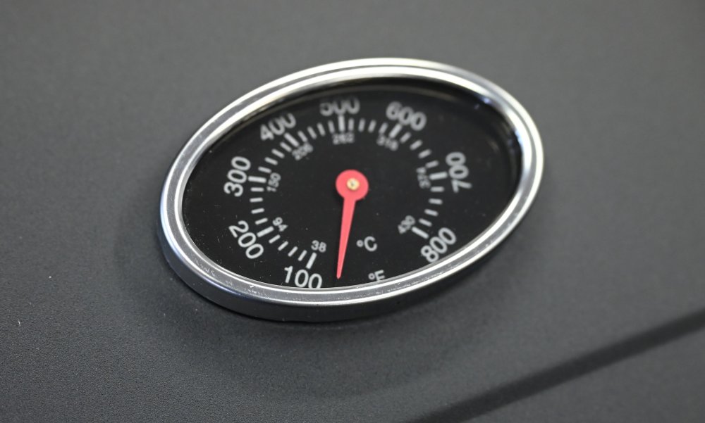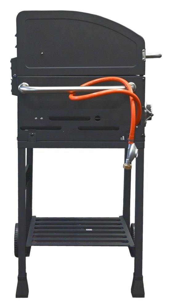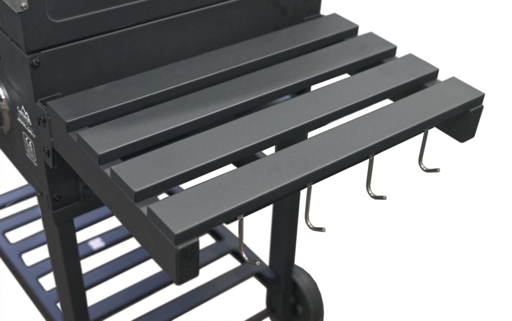 Ocelová konstrukce je opatřena hrubou černou povrchovou úpravou. Vyklápěcí víko je doplněno teploměrem pro stálou kontrolu teploty uvnitř grilu. Boční strana grilu je vybavena skládacím stolkem pro odkládání grilovacího příslušenství i samotných pokrmů. Madla i ovládací kovové prvky mají dostatečné rozměry pro pohodlný úchop a precizní ovládání. Čelní strana grilu je doplněna otvírákem lahví.