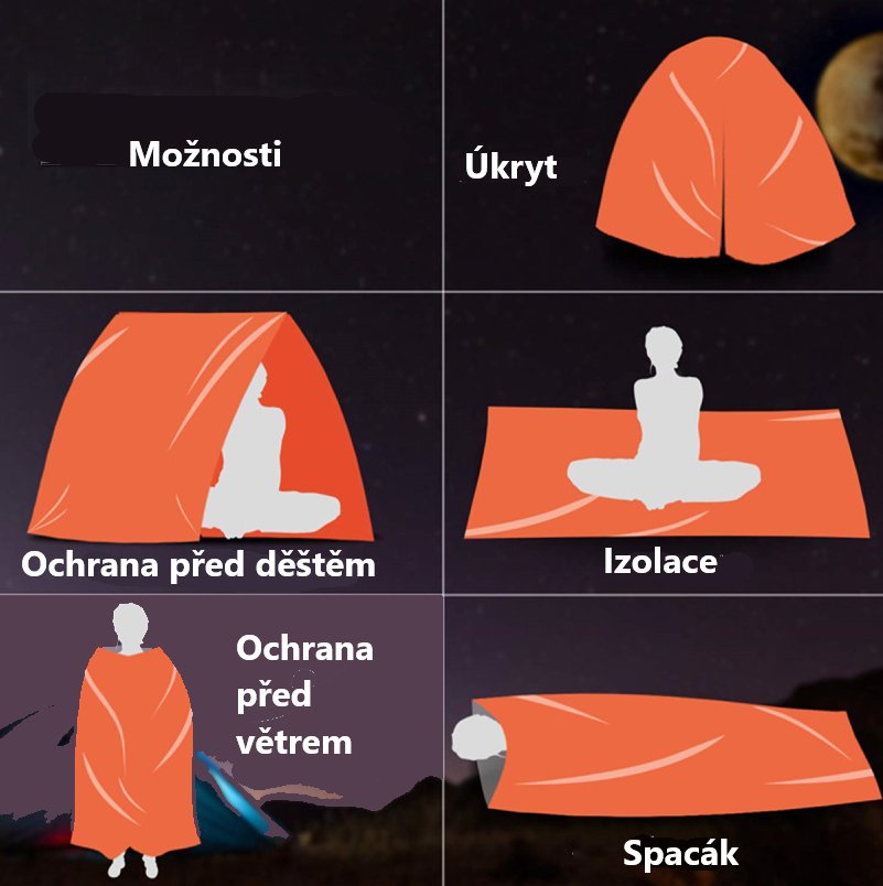 Základní funkcí je zabránění ztráty tepla vznikající odpařováním vody z povrchu těla. Pro zajištění maximálního efektu musí být člověk zabalený bez průduchů, kolem dokola. Podchlazený by měl být oblečený, přikrytý, izolovaný od studené země pomocí podložky (karimatky) a až nakonec obalený fólií. Provedení spacák - je jednodušší způsob zakrytí bez ůniků tepla. Obdobně jako spací pytel je vhodný i k ležení.