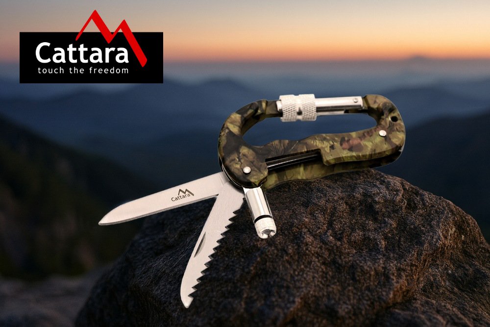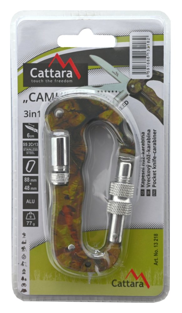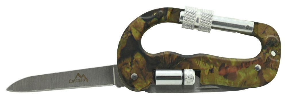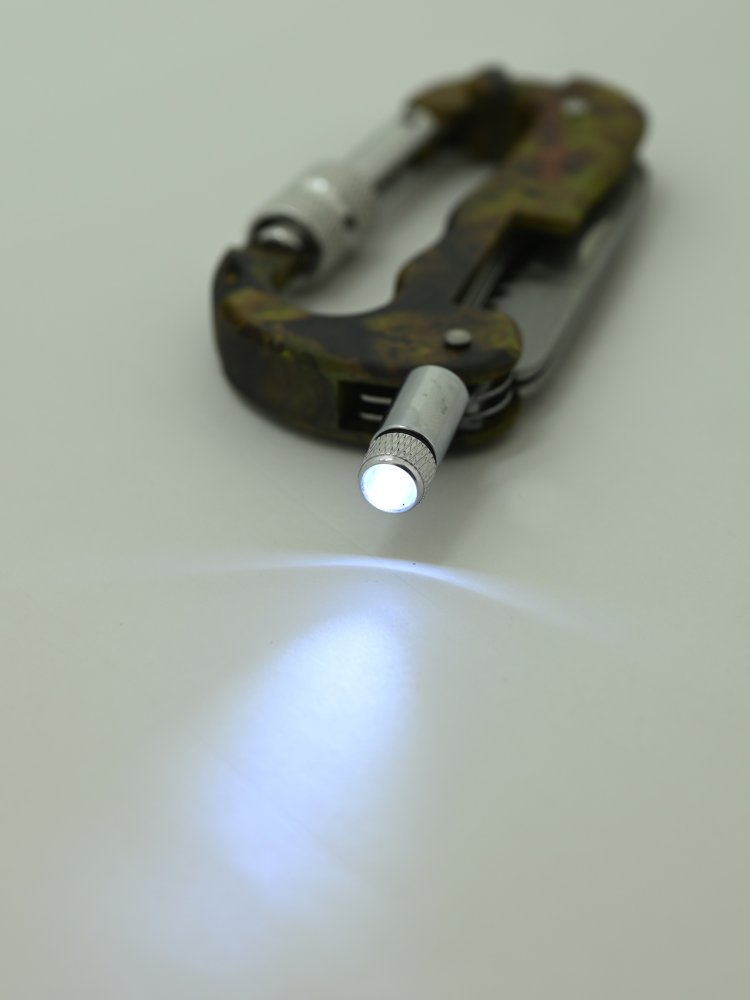 Multifunkční nůž / karabina KAMU 3v1 s LED svítilnou a nástroji z nožířské oceli. Užitečný pomocník pro camping, rybaření a další outdoor využití.