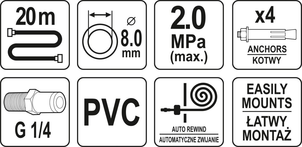 Profesionální naviják se vzduchovou hadicí s délkou 15 m zakončenou rychlospojkou. Naviják lze pomocí přiložených hmoždinek upevnit přímo na zeď. Hadice je zhotovená z PVC odolného vůči nízkým i vy...