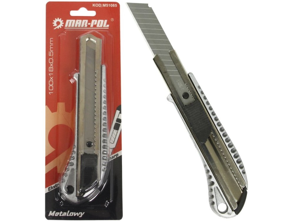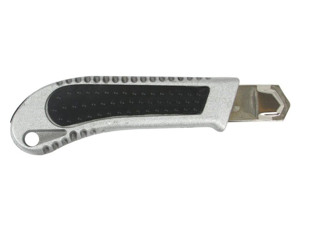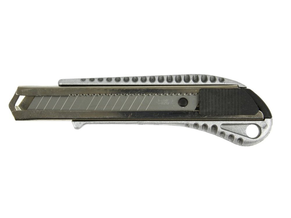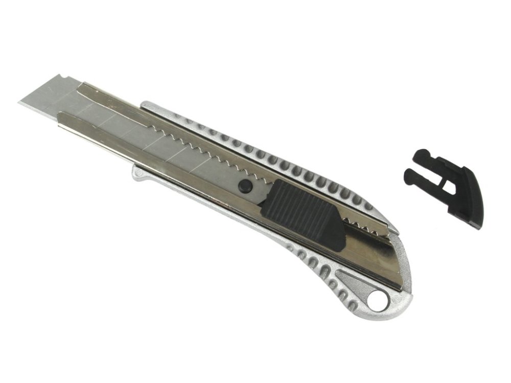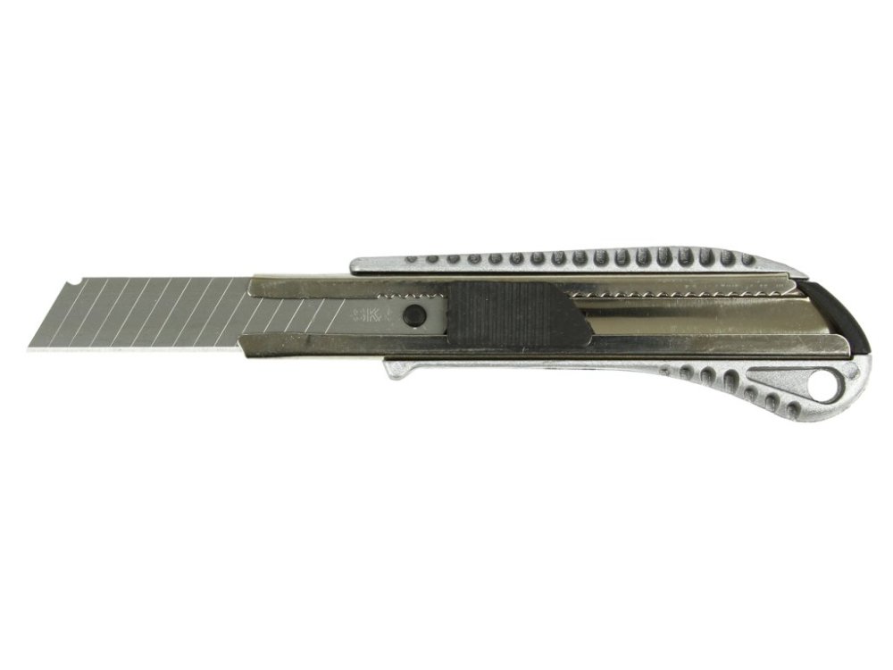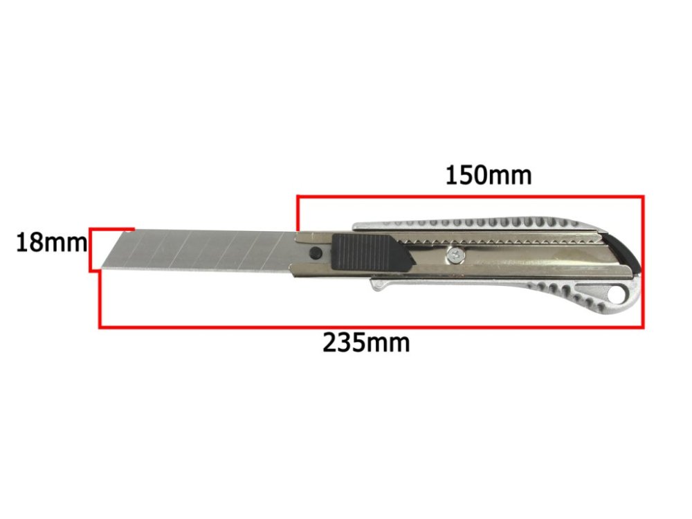 Model s 18 mm čepelí nabízí optimální kombinaci síly a přesnosti. Hliníkové tělo zajišťuje odolnost a nízkou hmotnost, kovové vodítko čepele garantuje stabilní vedení při řezu. Zasouvací, vyměnitelná odlamovací čepel 100x18x0,5 mm umožňuje rychlou výměnu i bezpečné uschování nástroje.
