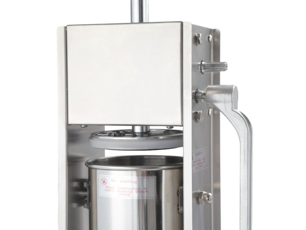 Plnička s výklopnou, odnímatelnou nádobou o rozměrech 140×320 mm s kapacitou 5 kg. Díky ozubenému mechanismu s 2stupňovým převodem dosahuje plnicí kapacity až 12 kg za hodinu, což zajišťuje efektivní zpracování masa. Píst je vybaven silikonovým těsněním, které spolehlivě zabraňuje úniku náplně během plnění.