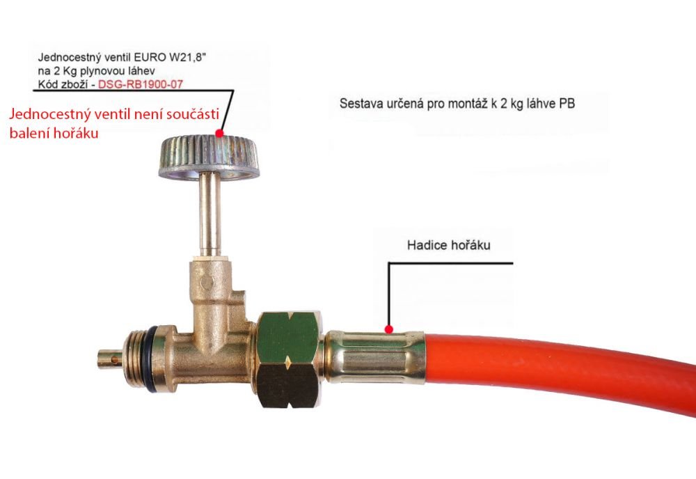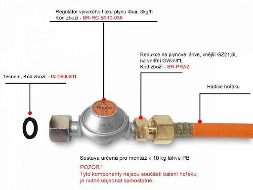Pro tento typ hořáku při připojení k 10 kg láhvi PB doporučujeme zakoupit regulátor vysokého tlaku, redukci a popřípadě jednocestný ventil na 2kg láhev PB. Těsnění na hadici na straně připojení k bombě není součástí balení.