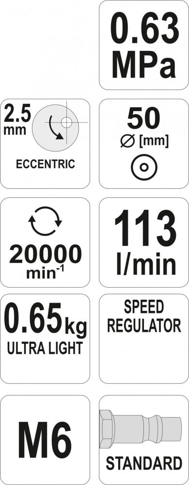 Profesionální excentrická bruska poháněná stlačeným vzduchem. Brusku lze použít na broušení i na leštění. Používá se v automobilových službách a v průmyslu. Technická data Průměr kotouče150 mm Tla...