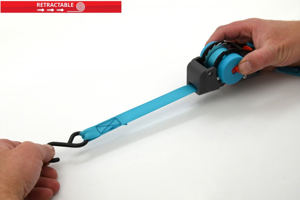 Samonavíjecí upínací popruh vysoké kvality s homologací TÜV/GS, k zajištění předmětů, zavazadel, nebo nákladu.