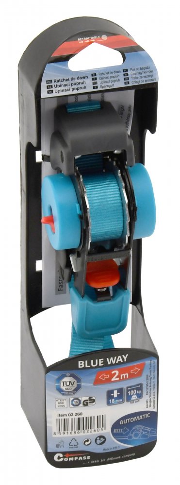 Samonavíjecí upínací popruh vysoké kvality s homologací TÜV/GS, k zajištění předmětů, zavazadel, nebo nákladu. Pro upnutí se využívá celokovová ráčna s jisticím mechanizmem. Ráčna je navíc opatřen...