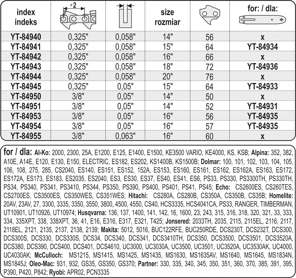 Délka 16", celkem 56 článků s roztečí 3/8" a šířkou 0,05" (1,3 mm).