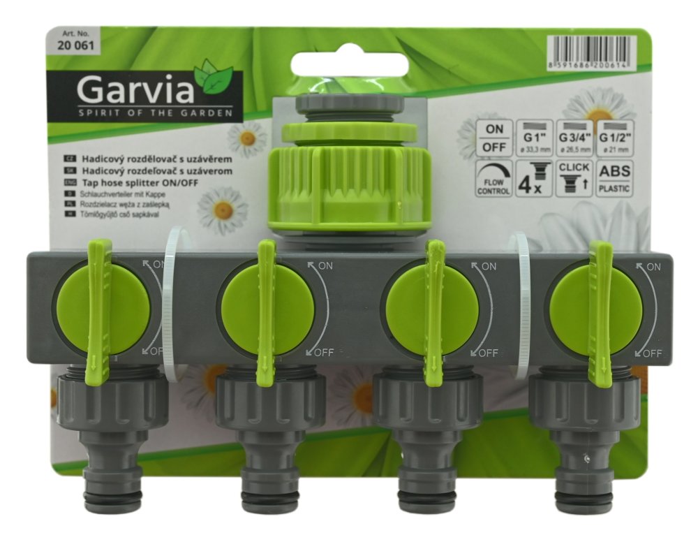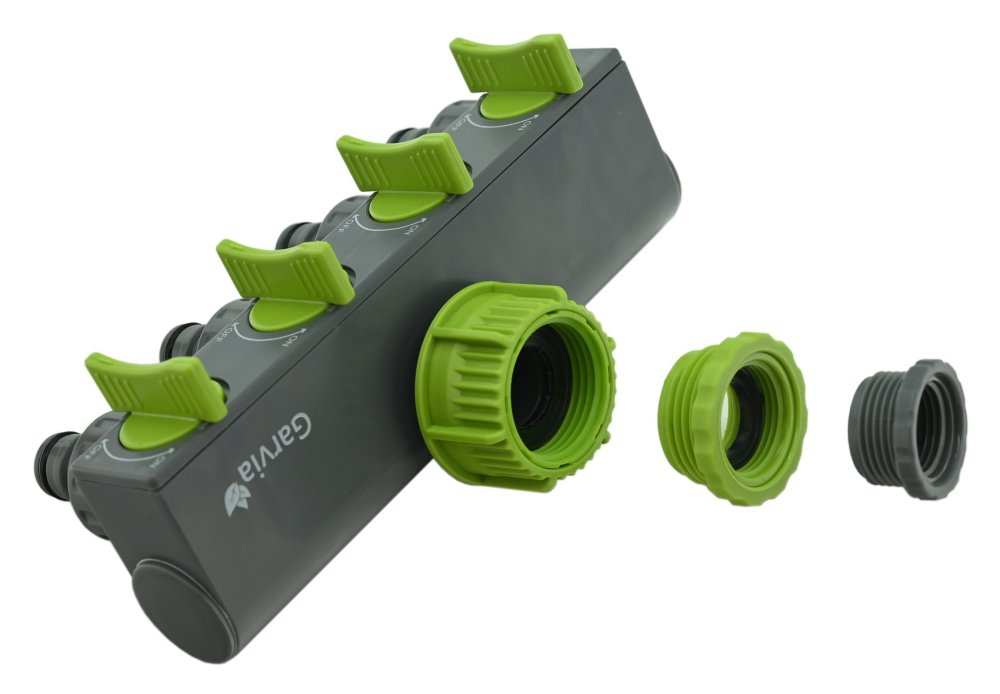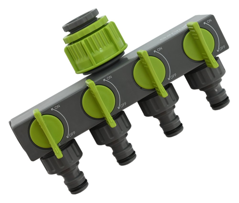 Rozdělovač umožňuje připojení až čtyř zahradních hadic opatřených rychlospojkou CLICK k jednomu kohoutku (G1/2", G3/4" nebo G1") a poskytuje individuální kontrolu průtoku vody.