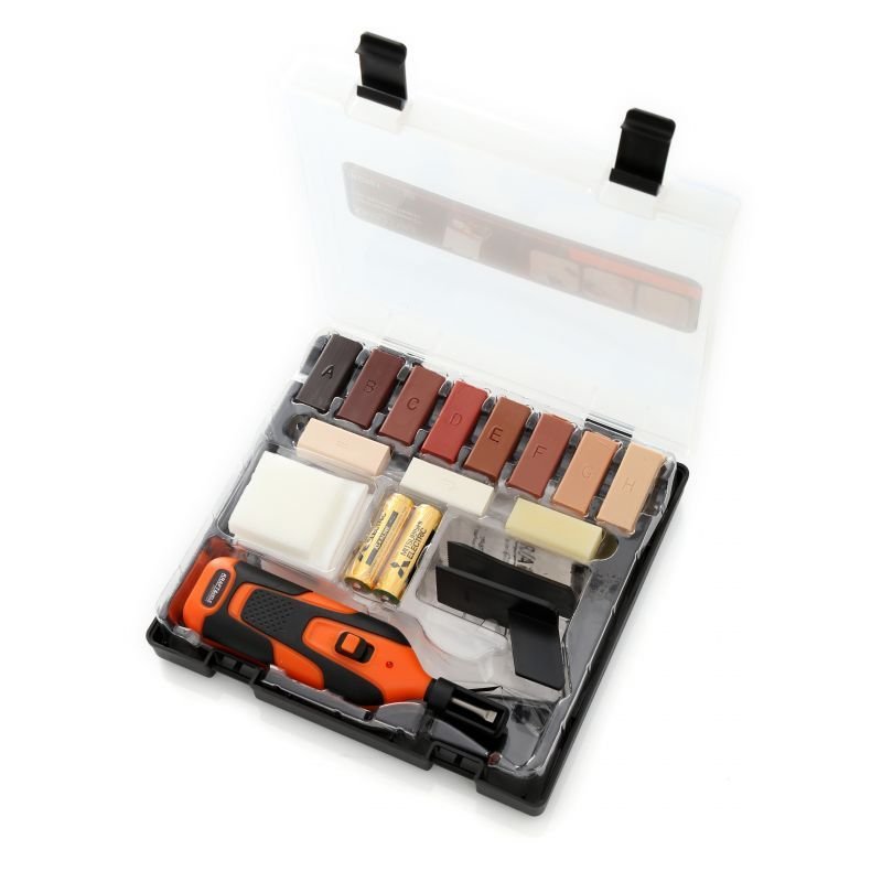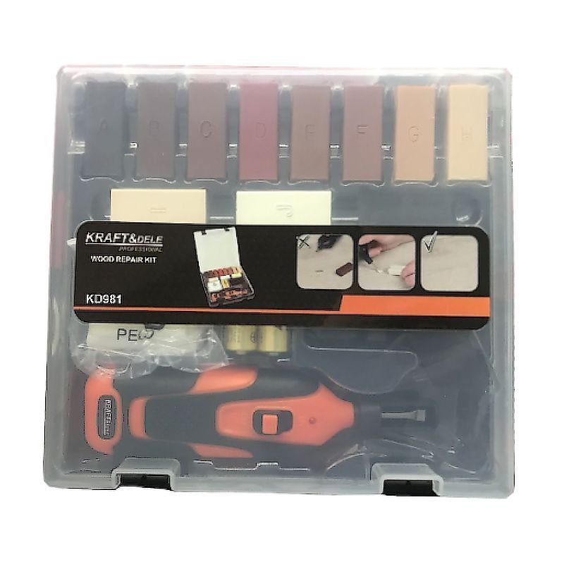 Sada na opravu dřeva KD981 pro jednoduchou opravu parket, laminátových, korkových, dřevěných a plastových povrchů roztavením vhodného vosku. Sada je umístěna v pevném, praktickém kufříku pro snadnou přepravu a skladování.