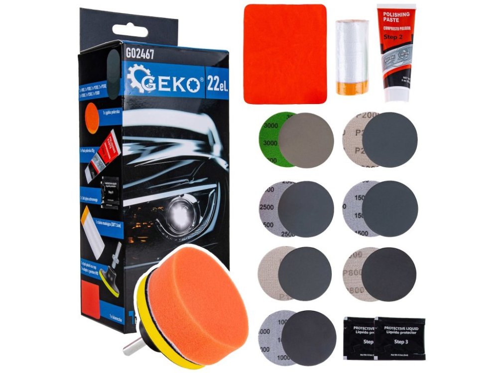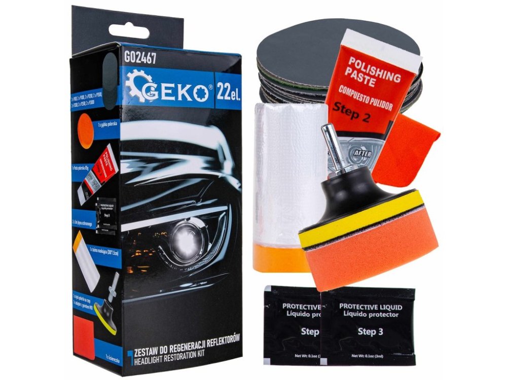 Sada na renovaci předních světlometů GEKO G02467 je ideálním řešením pro každého majitele vozu, který chce obnovit jas a průhlednost světlometů a zároveň odstranit matnost, škrábance nebo zažloutnutí. Díky této praktické 22-dílné sadě lze dosáhnout profesionálních výsledků bez nutnosti návštěvy servisu. Jednoduché použití, všestrannost a dlouhotrvající ochrana světel zajišťují, že vůz bude nejen lépe vypadat, ale také zlepší viditelnost na silnici za tmy.