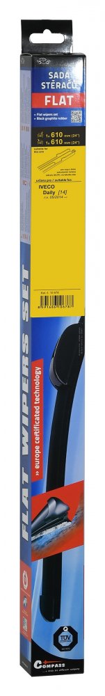 Sada dvou plochých stěračů FLAT (řidič + spolujezdec) se speciálním uchycením. Délky stěračů a systém uchycení na ramínko jsou přizpůsobeny vybraným vozům (viz tabulka použití).