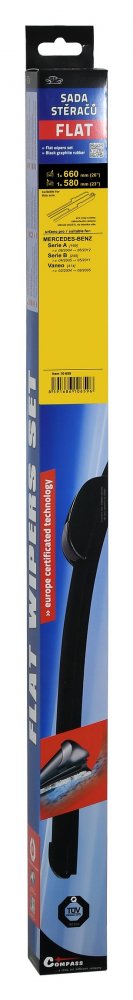 Sada dvou plochých stěračů FLAT (řidič + spolujezdec) se speciálním uchycením. Délky stěračů a systém uchycení na ramínko jsou přizpůsobeny vybraným vozům (viz tabulka použití).
