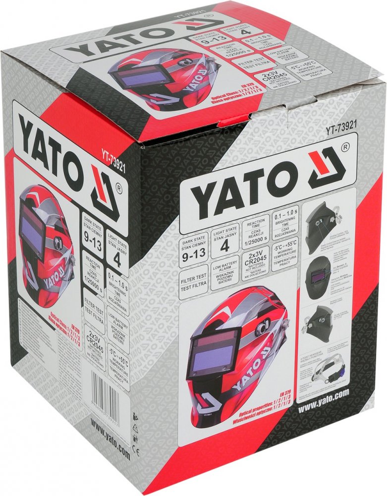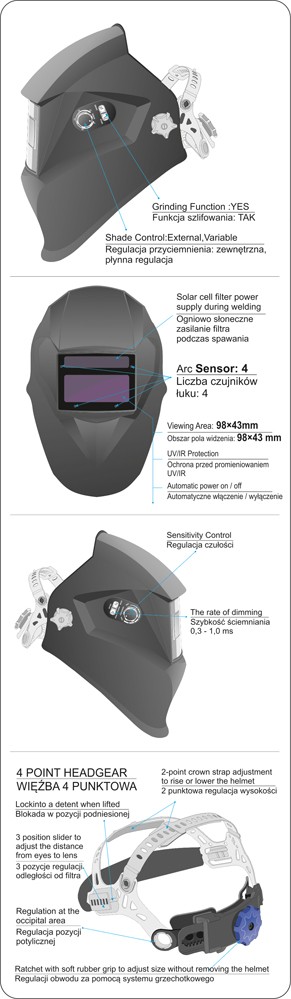 Svářečská kukla s automaticky ztmavujícím filtrem. Vysoce kvalitní filtr vybavený 4 obloukovými senzory poskytuje zorné pole 98 * 43 mm, DIN 9-13 tmavý stav, DIN4 světelný stav, doba odezvy 1/25000 s.