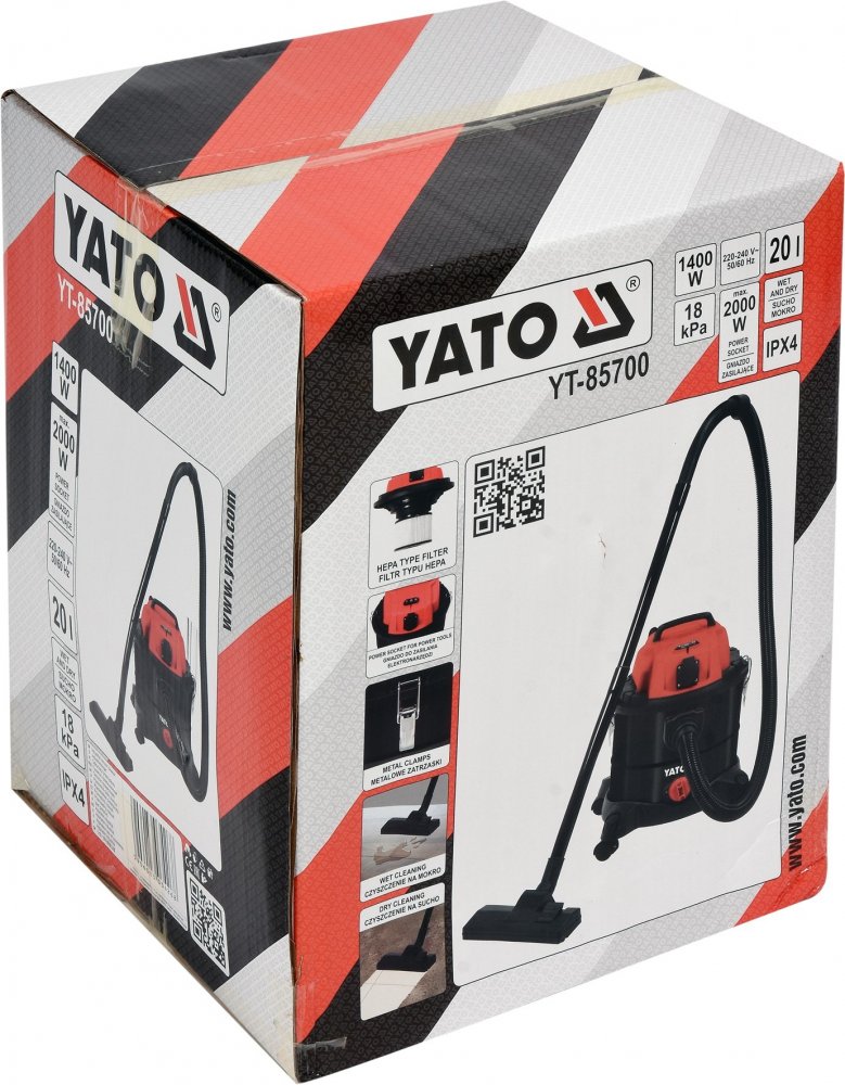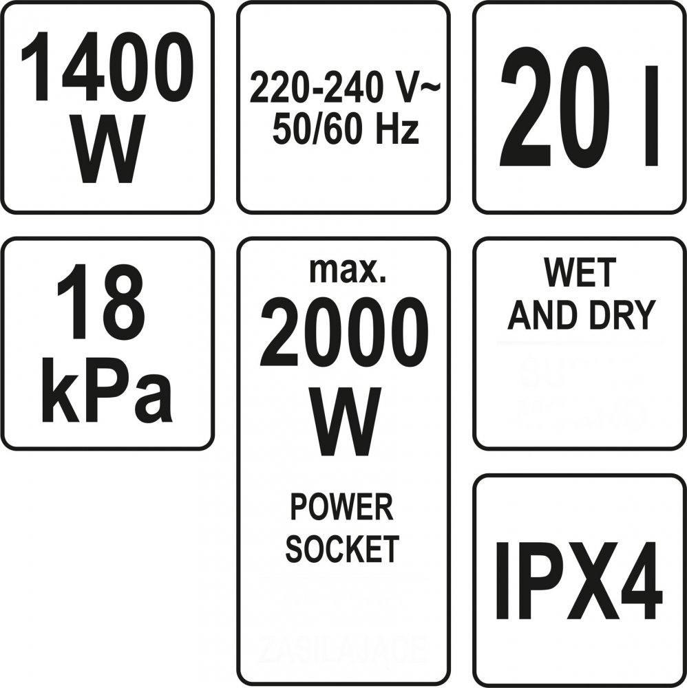 Průmyslový vysavač 1400 W s vysokým sacím výkonem 18 kPa a zásobníkem s objemem 20 l.