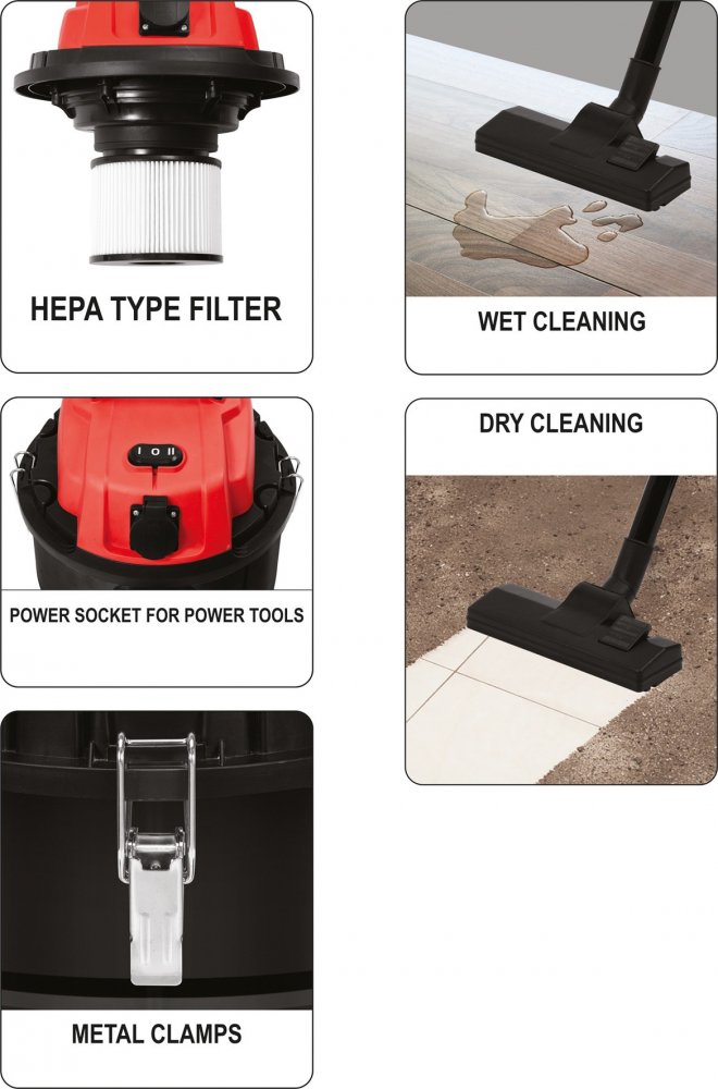 Vysavač je vybaven teleskopickou, antistatickou trubicí a HEPA filtrem. Tělo vysavače je opatřeno vestavěnou zásuvku, která umožňuje napájení dalšího elektrického nářadí. Je možné vysávat s, i bez pytle.