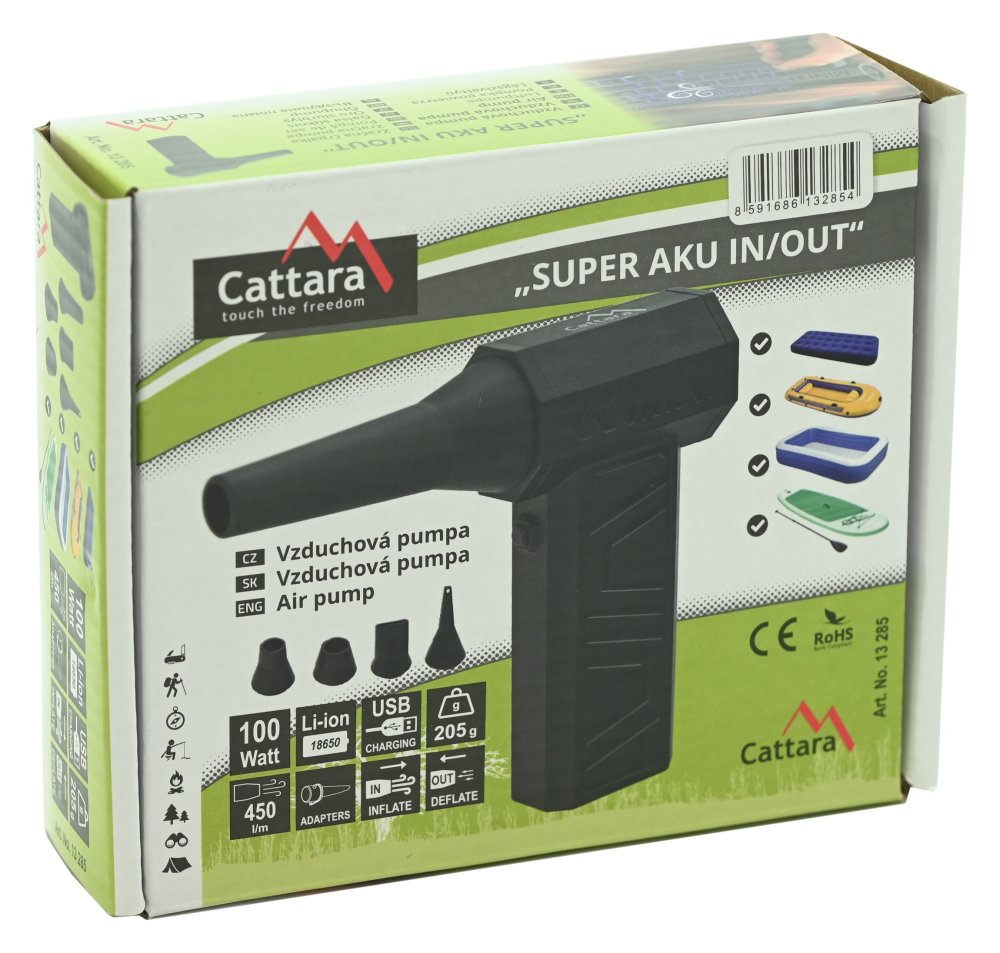 Vzduchová pumpa Cattara SUPER AKU IN/OUT je kompaktní bezdrátové univerzální zařízení určené pro nafukování a vyfukování předmětů.