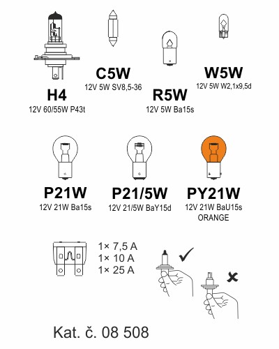 Servisní sada žárovek a pojistek v plastové krabičce pro Fabia III. Sada je složena z náhradních 12V žárovek a pojistek pro vozidlo. Homologace E. Balení obsahuje: 1ks H7 12V 55W PX26d 1ks PY21W 1...
