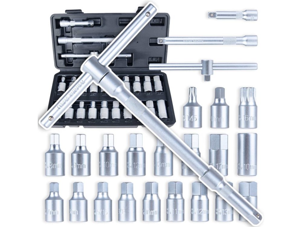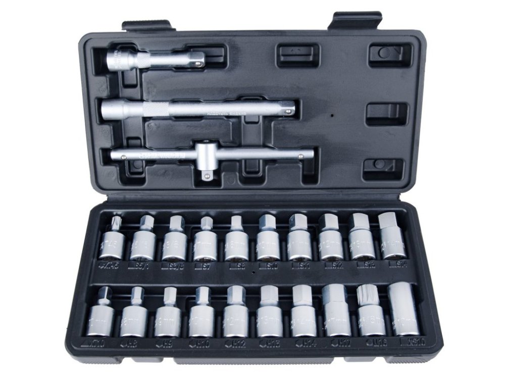 Sada na vypouštěcí zátky olejové vany určená pro širokou škálu použití v automobilových dílnách, na stanicích technické kontroly vozidel i pro kutily. Obsahuje široký sortiment hlavic – metrické šestihranné, palcové čtyřhranné, Torx a drážkové XZN – díky čemuž pokrývá prakticky všechny typy vypouštěcích zátek používaných v evropských, amerických i japonských automobilech.